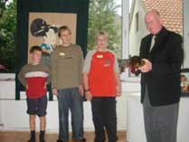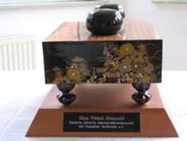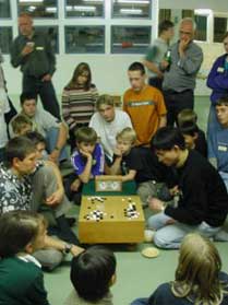 14 Schulmannschaften kämpften am 27.09.03, also an Hans' Geburtstag und an seinem Geburtsort um die Ehre und einige schöne Preise. Da ein Hamburger Team kurzfristig ausgefallen war, durften die zusätzlich mitgereisten Kids aus Oldenfelde ausnahmsweise ein zweites Team ihrer Schule bilden. Jeder Teilnehmer konnte sich bereits auf ein von Hideki Asai und Harald Kroll gespendetes "Hikaru no Go"-Gobrett freuen. Außerdem warteten auf alle Spielerinnen und Spieler schön gestaltete Teilnahmeurkunden. Für die Siegermannschaft stand als Wanderpokal ein kleiner lackierter Go-Tisch neben einem Bild von Hans Pietsch. Auch die Urkunde des Nihon-Kiin zur Würdigung seiner Leistungen, grafische Grundlage der Teilnahmeurkunden, wurde präsentiert.  |