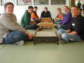 Herr Pietsch hatte es sich nicht nehmen lassen, eine Gruppe Go-Kids am Vormittag durch die Innenstadt zu führen und damit die Organisatoren zwei Stunden zu entlasten. Diese Gruppe gehörte zu den bereits am Freitag eingetroffen Mannschaften. Am Abend wurde das Dojo (Trainingsraum) des Budo-Clubs Bremen bereits intensiv zum Spielen genutzt. In diesem schönen Raum stand bereits eine Anzahl edler Go-Tische, die von befreundeten Gospielern zur Verfügung gestellt worden waren. | ![]() Der schönste Go-Tisch  |