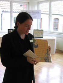 und Johannes Obenaus.  Das Ehepaar Pietsch zog bei der Verlosung der Poster, Magnet-Go-Spiele, Hikaru-Lesezeichen und Hikaru-Unterhosen (!) die Nummern, und Herr Pietsch überbrachte im Schlusswort der Veranstaltung Grüße vom Insei Benjamin Teuber. Herr Pietsch schloss das Turnier mit den Worten "Ich hoffe, alle Teilnehmer spielen auch im Jahr 2004 wieder mit, aber mutwillig beim Abitur durchzufallen wäre ein zu großes Opfer". Steffi Hebsacker überreicht ein Hikaru-No-Go-Brett  |