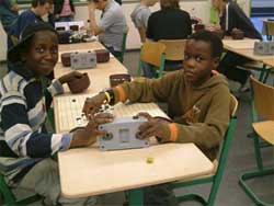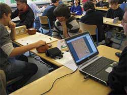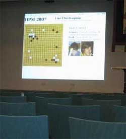 Die Möglichkeit der Live-Übertragung auf einen Beamer von bis zu drei Go-Partien war neu bei diesem HPM. Ursprünglich war diese für den Go-Kongress in Villach von Roland Lezuo programmiert, und dann von mir für das HPM angepasst worden. Alles, was man dafür benötigt, sind jeweils ein Laptop pro zu übertragende Partie, mit dem die Partie mitgeschrieben wird, ein zusätzlicher Laptop als „Server“, der die Partien zusammenfasst und den Beamer ansteuert, über den man die Spiele in der Aula der Schule verfolgen konnte. Vorteile dieser Methode sind, dass die Spieler nicht durch „Umherstehende“ gestört werden und dass man – genügend Laptops vorausgesetzt – bis zu drei Partien gleichzeitig verfolgen kann. Außerdem sind mit dieser neuen Technik Live-Kommentare möglich. Weitere praktische Aspekte sind, dass man z.B. nebenbei noch schnell etwas essen kann und die Turnierleitung Hinweise zum Ablauf des Turniers einblenden kann.