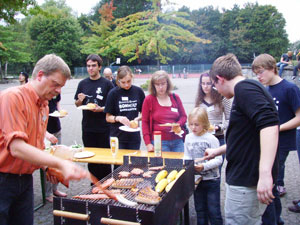 Doch auch während der Partien musste noch einiges organisiert werden, allem voran der etwas windschief stehende Grill, welcher an dem Abend noch benutzt werden sollte. Also wurden zwei arme Helfer mit Schraubenzieher und Eisenwolle ausgestattet, um den Grill in einen standfesten und ansehnlichen Zustand zu versetzen.