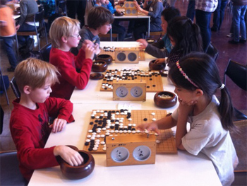Viele nutzten die Zwischenzeit aber auch, um an Simultan-Rengo-Partien teilzunehmen, die Lukas Krämer organisierte und in denen er gemeinsam mit den beiden Profi-Spielerinnen Chizu Kobayashi und Youngsun Yoon gegen bis zu zwanzig Schülerinnen und Schüler spielte. Gerade die Grundschüler aus Langerwehe konnten hier ihre Spielergebnisse aufbessern. Zwar hatten einige von ihnen alle Turnierpartien verloren; aber was bedeutete dies schon, wenn es ihnen in den Wartezeiten gelang, gegen asiatische Go-Profis zu gewinnen?