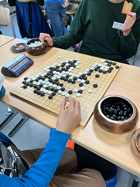 Am Samstagabend gab es das schon traditionelle Phantom-Go Turnier, bei dem die Spieler sich mit dem Rücken zugewandt sitzen und nicht sehen, wo der/die Mitspieler:in seine/ihre Steine platziert. Ein Schiedsrichter gibt dann an, ob der Zug möglich ist und ob Steine geschlagen werden.